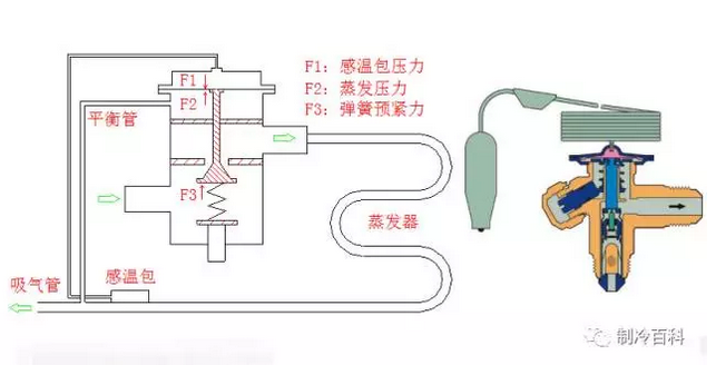 在熱力膨脹閥過熱度控制特性取決于溫包壓力F1與蒸發(fā)壓力F2+彈簧力F3之間的匹配關(guān)系。 F1=F2+F3
