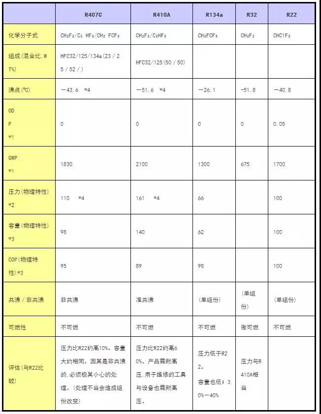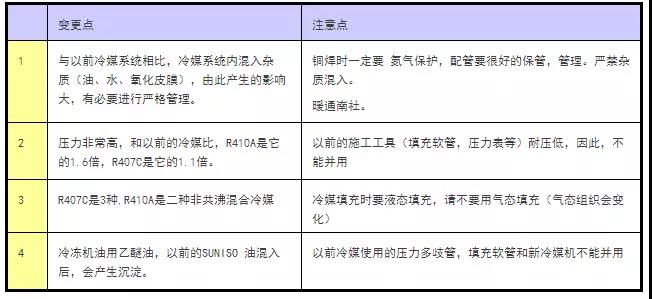 5新冷媒R407C,R410A和R22比較,有下面的注意點(diǎn):