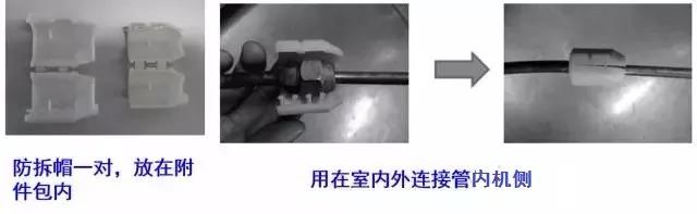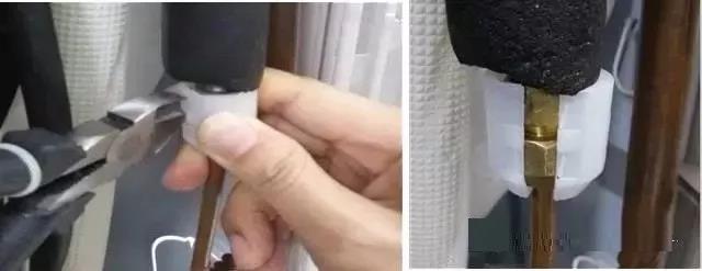 由于室內(nèi)側(cè)連接管外安裝有不可拆卸的防拆帽,所以當(dāng)涉及室內(nèi)機(jī)系統(tǒng)需要返回專業(yè)網(wǎng)點(diǎn)維修時(shí),必須破壞防拆帽,操作要求如下: