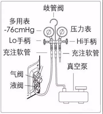 (3)完全打開歧管閥Lo(低壓)手柄,開動真空泵抽真空。