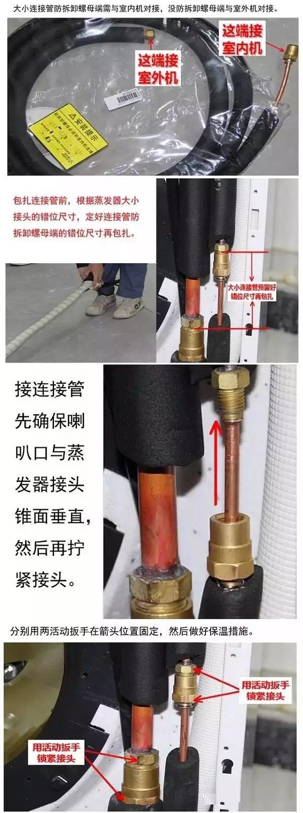 1)將連接管穿入室內(nèi)機(jī)對接,用扳手緊固大小連接管。
