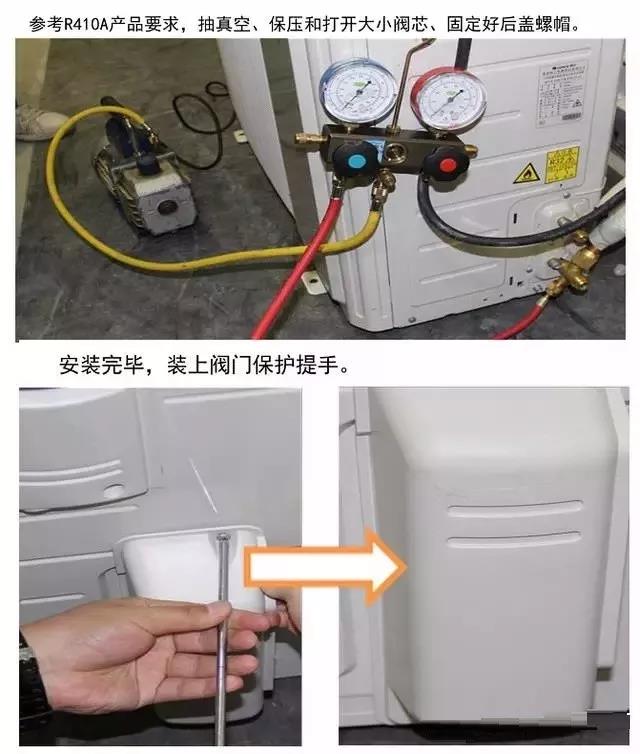參考R410A產(chǎn)品要求,抽真空、保壓和打開大小閥芯、固定好后蓋螺帽。嚴(yán)禁采用機(jī)內(nèi)冷媒排空!具體抽空步驟如下: