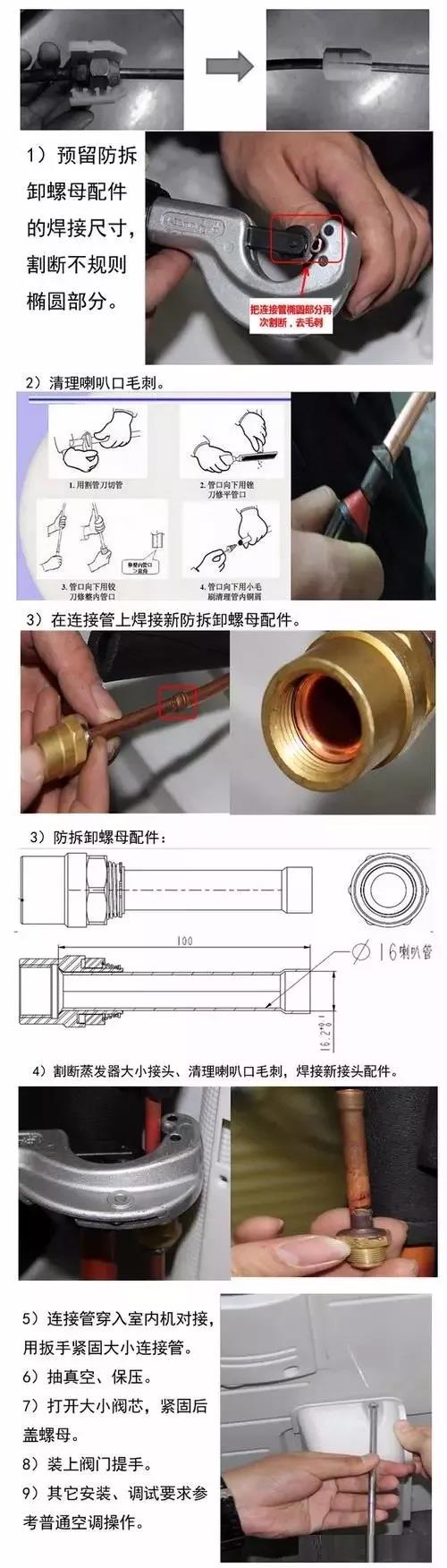 拆機(jī)時(shí)盡量采取連接管與內(nèi)機(jī)一起抽出;如連接管太長,采取從外側(cè)割管,再加長焊接的方式處理。