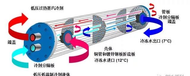 (干)式蒸發(fā)器殼管:蒸發(fā)器的制冷劑在管內流動,水在管簇外流動。制冷劑流動通常有幾個流程,由于制冷劑液體的逐漸氣化,通常越向上,其流程管數(shù)越多。為了增加水側換熱,在筒體傳熱管的外側設有若干個折流板,使水多次橫掠管簇流動。